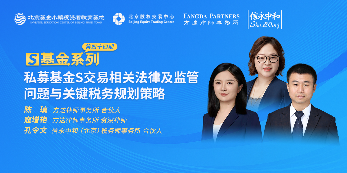 1月9日,北京基金小镇联合北京股权交易中心、方达律师事务所、信永中和(北京)税务师事务所有限公司共同举办“私募基金S交易相关法律及监管问题与关键税务规划策略”主题分享会。方达律师事务所合伙人陈瑱律师、资深律师寇增艳律师从私募基金S交易方式及主要合规考量因素等方面进行分享,信永中和(北京)税务师事务所有限公司合伙人孔令文立足于全角度覆盖的“以数治税”征管环境下,合伙基金税务风险事项做出分析,希望对基金管理过程中的纳税合规与风险管控有所助力。