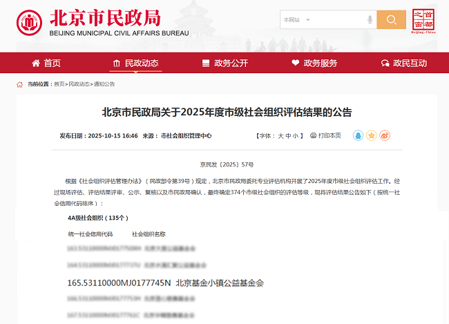 近日,北京市民政局官网发布《关于2025年度市级社会组织评估结果的公告》。根据《社会组织评估管理办法》(民政部令第39号)规定,经专业评估机构进行现场评估、结果评审、社会公示、复核以及市民政局确认,北京基金小镇公益基金会获评4A级社会组织。据悉,在本次评估中,北京市仅有4家社会组织新晋获评4A等级。